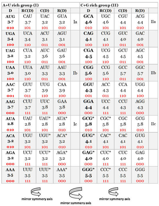 Our quadruplet classification of 61 codons and 3 stop signals (with U-uracil) for genetic code, or trinucleotides (with T-thymine instead of uracil) for RNA and DNA genomes with incorporated the free energy of codons (reading unidirectionally from 5′ to 3′). Each quadruplet is unique and consists of codons or trinucleotides denoted as direct D, and reverse complement from direct RC(D), complement from direct C(D), and reverse from direct R(D). The ten A + U-rich (group I) and ten C + G-rich (group II) quadruplets are organized in three subgroups. The Ia subgroup consists of nonsymmetrical codons/trinucleotides containing four different nucleotides; the Ib subgroup consists of nonsymmetrical codons/trinucleotides containing two different nucleotides; the Ic subgroup consists of symmetrical codons/trinucleotides which contain duplicated codons/trinucleotides labeled with an asterisk (D = RC, C = R). The first four A + U-rich quadruplets we generated with start/stop signals: AUG, UGA, UAG, and UAA. The C + G-rich trinucleotides correspond to purine–purine and pyrimidine–pyrimidine transformations of A + U-rich codons/trinucleotides. Three symmetries are present in our codon/trinucleotide classification: (1) purine–pyrimidine symmetries in each quadruplet; (2) purine–pyrimidine symmetries within and between A + U-rich and C + G-rich quadruplets in the same row of the classification; (3) mirror symmetry between direct–reverse and complement–reverse complement in the same quadruplet. For clarity, the white and grey rows are alternating, to emphasize pairs of A + T-rich and C + G-rich codons. Note: 0—purine; 1—pyrimidine. Namely, it is irrelevant which codon/trinucleotide in the quadruplet is direct, because the other three are accordingly adapted.