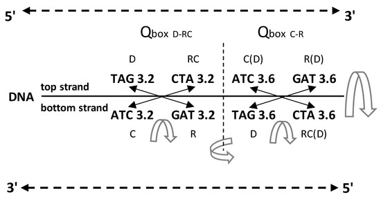 An important characteristic of the SSyGC table is the direct transformation of genetic code in the DNA molecule through linearizing codons from a direct pair of codon boxes for the top strand alternately, with codons from a complement pair of boxes for the bottom strand of DNA. In this case, the alignment of the 192 bases (61 codons and 3 stop signals) contains 10 A + T-rich quadruplets and 10 C + G-rich quadruplets (Figure 2) [7]. Each quadruplet contains four types of trinucleotides: direct, reverse complement, complement, and reverse. We relate Chargaff’s second parity rule to the interstrand mirror symmetry in 10 A + T-rich and 10 C + G-rich symbolic purine–pyrimidine symmetry quadruplets of trinucleotides mapped to the double-stranded genome. The symmetries of the Q-box corresponding to quadruplets can be obtained due to a combination of Watson–Crick base pairing and Chargaff’s second parity rule. We show that, alternatively, assuming the natural symmetry law for DNA creation and conservation that each trinucleotide (or mono/oligonucleotide) in one strand of DNA must also simultaneously appear in the opposite strand, regardless of localization, automatically leads to direct–reverse mirror symmetry between both strands of the Q-box. In conjunction with Watson–Crick base pairing, this also automatically generates 5′3′ ↔ 3′5′ bidirectional strand construction of the DNA molecule and, automatically, Chargaff’s second parity rule [5,7]. The quadruplet symmetries are characterized by the same symmetries as the SSyGC table: purine–pyrimidine symmetry and direct–complement symmetry. These are based on the trinucleotides between both strands and on the principle of the Watson–Crick pairing, and the mirror symmetry within each Q-box and between Q-boxD-RC and Q-boxC—R. (Figure 3). Empirically, it is known that the relative frequencies of all four trinucleotides within each Q-box are almost equal, although they do differ among both Q-boxes. However, the sum of relative frequencies from both strand of each member of quadruplets is precisely the same [5,7].