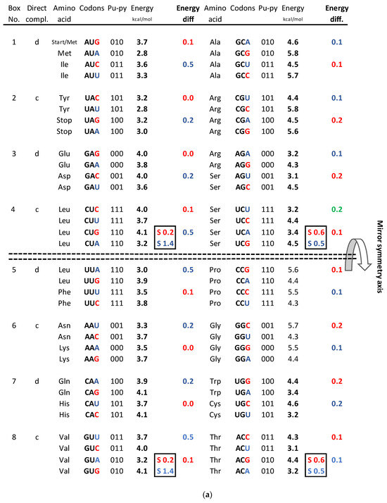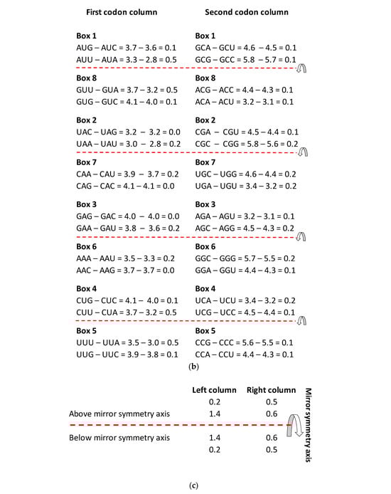- All 16 symmetrical codons in the direct–complement pair of boxes have completely identical free energy of codons (e.g., AUA 2.8 kcal/mol–UAU 2.8 kcal/mol; CCC 5.5 kcal/mol–GGG 5.5 kcal/mol) (Figure 2).