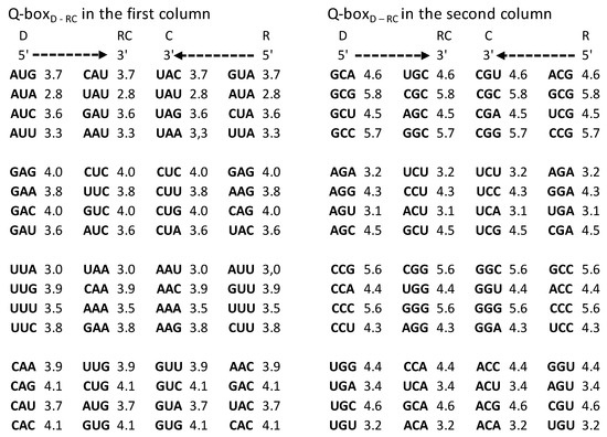 Quadruplet boxes (Q-boxes) of codons (D—direct; RC—reverse complement; C—complement; R—reverse) arranged as in the SSyGC table in the form of DNA quadruplets with mirror symmetry (see also Figure 2 and Figure 3). The corresponding value of free energy is given with each codon. It is necessary to read bases/codons of the Q-box bidirectionally (5′3′ top strand, 3′5′ bottom strand). Full agreement of the identical free energy values for all four members in each Q-box is present. The inputted measured free energy values are from [8,9].