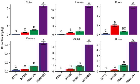 The Cd content in different organs of B73 and the mutant. L represents the low-Cd condition, H represents the high-Cd condition, Mutant represents the genotype ZmHMA3, and Cd represents cadmium. The upper letter in each column indicates the difference derived from Duncan’s multiple range test.
