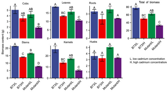 The biomass content in different organs of B73 and the mutant under diverse Cd stress conditions. Mutant represents the genotype ZmHMA3, and Cd represents cadmium. The upper letter in each column indicates the difference derived from Duncan’s multiple range test.