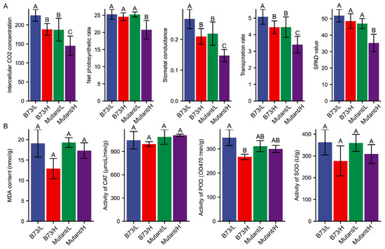 The physiological response to Cd stress of B73 and the mutant. (A) The response of photosynthetic parameters under different Cd stress conditions. (B) The response of antioxidant enzymes under different Cd stress conditions. L represents the low-Cd condition, H represents the high-Cd condition, Mutant represents the genotype ZmHMA3, and Cd represents cadmium. The upper letter in each column indicates the difference derived from Duncan’s multiple range test.