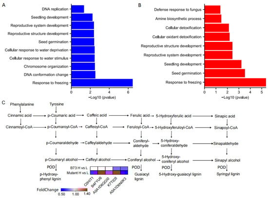The functional enrichment analysis of DEPs in B73 and the mutant. (A) The significant GO terms of biological processes involved in the DEPs in B73. (B) The significant GO terms of biological processes involved in the DEPs in the mutant. (C) The metabolic pathway of lignin biosynthesis. The heatmap shows the 5 DEPs catalyzed in the final step. L represents the low-Cd condition, H represents the high-Cd condition, Mutant represents the genotype ZmHMA3, and DEPs represents the differentially enriched proteins.