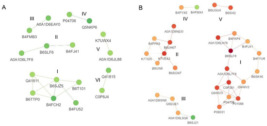 To obtain a comprehensive understanding of the response to Cd stress in B73 and ZmHMA3, a protein–protein interaction map of DEPs was generated, considering confidence scores higher than 0.7 (Figure 6). In the protein–protein interaction of B73, 17 down-regulated DEPs formed 2 networks and 4 pairs of interacting proteins (Figure 6A). The largest group (cluster I) consisted of six histone proteins. In ZmHMA3, 3 networks and 2 pairs of interacting proteins were observed, comprising 26 up-regulated and 2 down-regulated DEPs (Figure 6B). The top two groups (cluster I and Cluster II) included 13 and 7 up-regulated DEPs, predominantly associated with biotic or abiotic stress and nutrient storage. Additionally, two protein pairs were identified to be involved in stress response (Cluster IV) and nutrient storage (Cluster V).