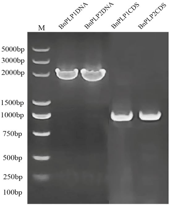 BnPLP1 and BnPLP2 were amplified from the DNA of “APL01” using two pairs of primers (PR1 and PR2) and 2×TransTaq® High-Fidelity (HiFi) PCR SuperMix I (-dye) (TransGen Biotech). The thermocycler program comprised a 5-min incubation at 94 °C, followed by 35 cycles consisting of a 30-s denaturation at 94 °C, a 30-s annealing at 58 °C, and a 2-min extension at 72 °C. Subsequently, the program concluded with a 10-min final extension step at 72 °C. The CDS values of BnPLP1 and BnPLP2 were amplified from the cDNA of “APL01” using two pairs of primers (PR3 and PR4), and the amplification was carried out with 2×TransTaq® High-Fidelity (HiFi) PCR SuperMix I (-dye) (TransGen Biotech). The thermocycler program consisted of 5 min at 94 °C, 35 cycles of 30 s at 94 °C, 30 s at 60 °C, and 1 min at 72 °C followed by 10 min at 72 °C. All primers used in this study were designed using the Primer 5 software and synthesized by Tsingke Biotechnology Co. (Beijing, China). The sequences of these primers are listed in Table S1. After that, the PCR product was cloned into the pEASY®-T1 cloning vector (TransGen Biotech), followed by transformation into Escherichia coli competent cells (Trans1-T1 Phage Resistant Chemically Competent Cell, TransGen Biotech), and finally subjected to sequencing using primers M13F 5′-GTAAAACGACGGCCAGT-3′ and M13R 5′-CAGGAAACAGCTATGAC-3′. The alignment of DNA and CDS sequences between these two genes was performed using Clustal-W.