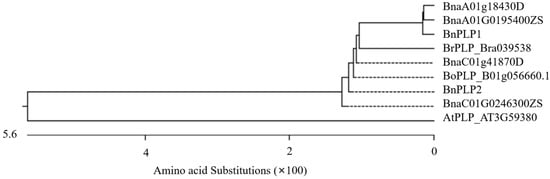 The CDS values of the PLP gene in B. napus, B. rapa, and B. oleracea were retrieved by conducting a blast search against the reference genome databases of B. napus [2,61], B. rapa [62], and B. oleracea [63] using the CDS of AtPLP [48] as a reference. At the same time, the amino acid sequences of the proteins encoded by these PLP homologous genes were also obtained from these reference genome databases. These sequences were aligned by Clustal-W (University College Dublin, Dublin, Ireland), and a neighbor-joining tree was built using MEGA version 4.0 [64]. BnPLP1 and BnPLP2 protein domain analysis was performed using the Pfam domains database (https://www.ebi.ac.uk/interpro/) (accessed on 1 September 2023).