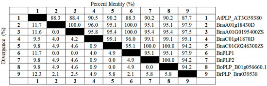 Analysis of the similarity of coding sequence between homologous genes of PLP in Arabidopsis thaliana, Brassica rapa, Brassica oleracea and three Brassica napus rapeseed varieties. “Percent Identity” refers to the similarity between amino acid sequences of genes. “Divergence” refers to the differences between amino acid sequences. Numbers 1 to 9, respectively, represent AtPLP_AT3G59380, BnaA01g18430D, BnaA01G0195400ZS, BnaC01g41870D, BnaC01G0246300ZS, BnPLP1, BnPLP2, BoPLP_B01g056660.1, and BrPLP_Bra039538.