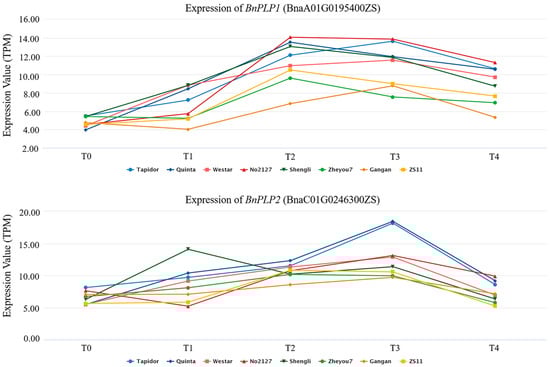 Based on the multi-omic information resources of B. napus [55], the spatiotemporal expression characteristics of BnPLP1/2 genes were obtained and visualized. From the perspective of gene expression temporal patterns, the expression levels of BnPLP1/2 showed an increasing trend followed by a decreasing trend with the progression of growth time in eight varieties of B. napus leaves, namely, “Westar”, “Quinta”, “Tapidor”, “Shengli”, “Zheyou”, “Gangan”, “ZS11”, and “No2127” (Figure 4). The expression level of BnPLP1 (BnaA01T0195400ZS) reached its maximum in the leaves at 82 days after sowing (T2), except for in the varieties “Tapidor”, “Westar”, and “Gangan”, where it was downregulated afterwards (Figure 4). On the other hand, the expression level of BnPLP2 (BnaC01G0246300ZS) reached its maximum in the leaves at 115 days after sowing (T3), except for in the variety “Shengli”, where it was downregulated afterwards (Figure 4). Overall, the temporal expression patterns of BnPLP1 and BnPLP2 in different rapeseed varieties’ leaves are relatively conservative.