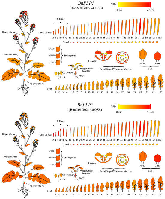 Tissue expression characteristics of BnPLP1 and BnPLP2 genes in Brassica napus. Data related to TPM, which stands for Transcripts Per Million, indicate that the higher the TPM value, the darker the color in the corresponding tissue, indicating a higher gene expression level in that tissue.
