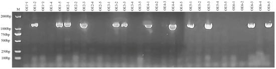 For the creation of transgenic Arabidopsis plants overexpressing the BnPLP1 gene (using OE as the plant code), PCR analysis was used to identify 12 positive second-generation transgenic (T2) plants from 30 T2 plants derived from 6 first-generation transgenic (T1) plants (selecting 5 T2 plants randomly from the T2 generation individuals of each T1 plant) (Figure 6). Two positive plants were identified among the five T2 individuals of each T1 plant. Quantitative reverse transcription PCR (qRT-PCR) analysis of the BnPLP1 expression levels in these 12 plants revealed significant upregulation in 9 plants compared to the wild type plants (Figure 7), which were selected as positive transgenic candidate plants showing a stable overexpression of the BnPLP1 gene. Furthermore, by using a combined approach of PCR and qRT-PCR analysis, the genotypes and expression levels of the BnPLP1 gene in the third-generation transgenic (T3) plants of these nine positive T2 candidate plants were identified. The results indicate that the genotype (BnPLP1/BnPLP1) and overexpression of the BnPLP1 gene in five transgenic candidate T2 Arabidopsis plants (i.e., OE1-5, OE2-3, OE5-1, OE5-3, and OE6-5) are stably inherited in T3 plants (Figures S2 and S3). Subsequently, the phenotypes of T3 plants derived from these five stable overexpressing BnPLP1 T2 plants were measured.