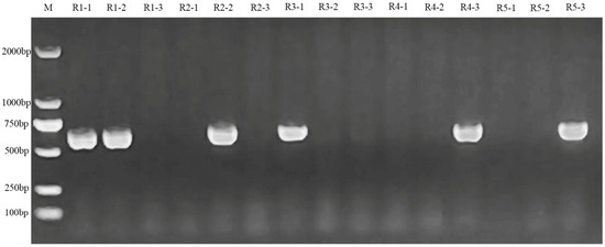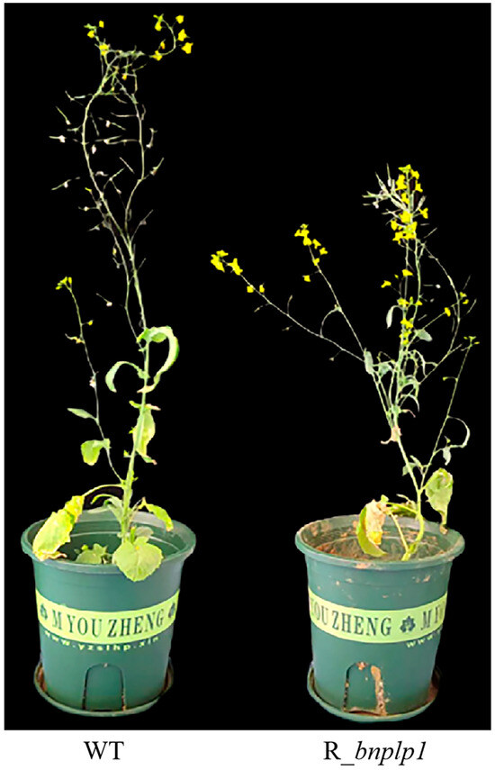 For the creation of RNA interference plants of B. napus with the downregulated expression of the BnPLP1 gene (using R as the plant code), PCR analysis was used to screen 6 positive T2 plants from 15 T2 plants derived from 5 T1 plants (3 T2 plants were randomly selected from the T2 generation individuals of each T1 plant) (Figure 8). The qRT-PCR analysis revealed that the expression levels of BnPLP1 in five out of the six T2 plants were significantly lower than those in the wild type (Figure 9), and these five plants were selected as stable positive transgenic candidates with BnPLP1 silencing. Furthermore, PCR analysis and qRT-PCR analysis were performed to identify the genotypes and expression levels of the BnPLP1 gene in T3 plants generated from these five candidate T2 plants. The results indicate that the genotype (bnplp1/bnplp1) and down-regulated expression of the BnPLP1 gene were stably inherited in the T3 plants of three rapeseed positive T2 candidates (namely, R1-1, R2-2, and R3-1) (Figures S4 and S5). Subsequently, the phenotype of the T3 plants derived from these three T2 plants expressing downregulated BnPLP1 was determined.