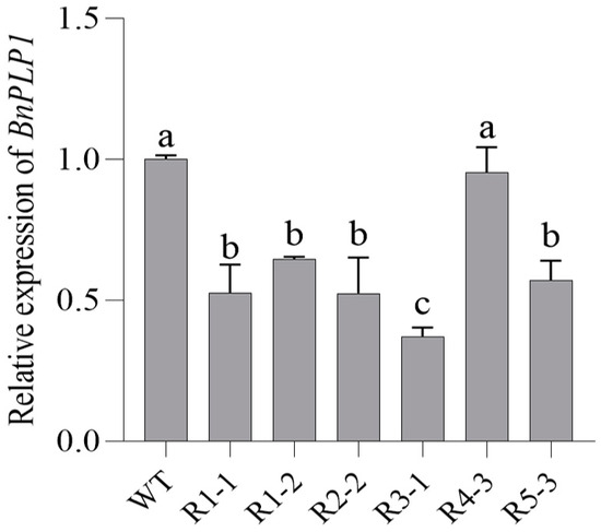 qRT-PCR identification of BnPLP1 gene expression in RNA interference transgenic T2 plants of Brassica napus. The lowercase letters labeled on the bar graph indicate the significance of differences in BnPLP1 gene expression levels between genetically modified plants and wild-type.