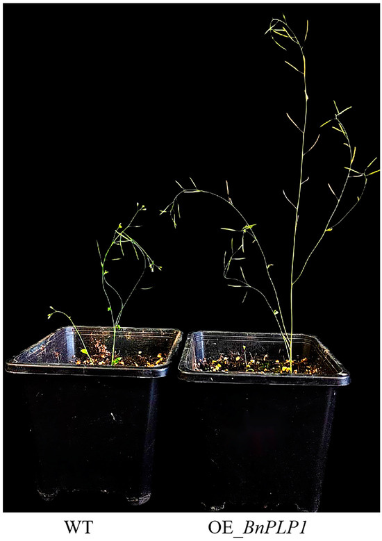 Comparing the plant height, main inflorescence length, and primary branching number between genetically modified Arabidopsis thaliana (GM) and wild type plants, it was found that the plant height and length of the main inflorescence were significantly higher in five GM plants overexpressing the BnPLP1 gene (OE1-5, OE2-3, OE5-1, OE5-3, and OE6-5) compared to the wild type (Figure 10, Table 3). However, there was no significant difference in the number of primary branches between the GM and wild type plants (Table 3).