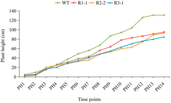 Growth dynamics of the plant height in stable downregulated BnPLP1-expressing Brassica napus plants and wild type plants. WT refers to wild type Brassica napus plants. R represents Brassica napus plants with expression of the BnPLP1 gene downregulated by RNA interference. PH1: 12 days after sowing; PH2: 19 days after sowing; PH3: 26 days after sowing; PH4: 33 days after sowing; PH5: 40 days after sowing; PH6: 47 days after sowing; PH7: 54 days after sowing; PH8: 61 days after sowing; PH9: 68 days after sowing; PH10: 75 days after sowing; PH11: 82 days after sowing; PH12: 89 days after sowing; PH13: 96 days after sowing; PH14: 103 days after sowing.