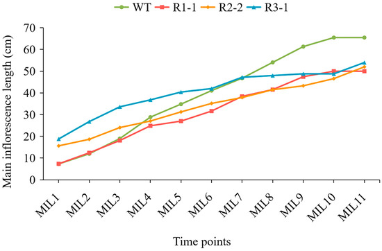 Growth dynamics of the main inflorescence length in stable downregulated BnPLP1-expressing Brassica napus plants and wild type plants. The definitions of WT and R are consistent with those in Figure 12. MIL1: 33 days after sowing; MIL2: 40 days after sowing; MIL3: 47 days after sowing; MIL4: 54 days after sowing; MIL5: 61 days after sowing; MIL6: 68 days after sowing; MIL7: 75 days after sowing; MIL8: 82 days after sowing; MIL9: 89 days after sowing; MIL10: 96 days after sowing; MIL11: 103 days after sowing.