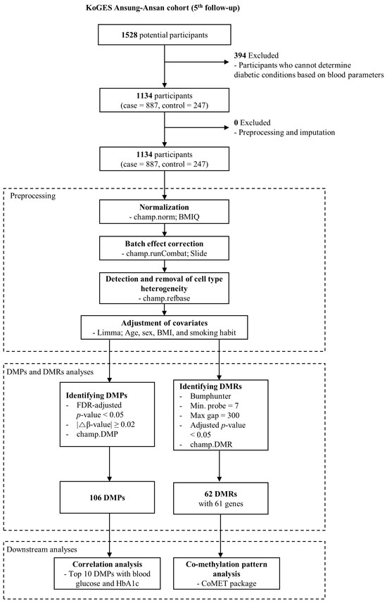 Flowchart of this study. Among the initial 1528 potential participants from the AS-AS cohort in KoGES at the 5th follow-up, individuals were categorized into either the T2DM (case) or normal (control) groups based on blood parameters, including FPG, HbA1c, and 2 h PG, as described in the Section 2. This process resulted in 1134 remaining participants (T2DM = 887, normal = 247) eligible for DNA methylation analysis. Subsequently, the HM850k data for these 1134 samples underwent preprocessing, involving normalization using the β-mixture quantile normalization (BMIQ) method, technical batch effect correction for slides using the Combat algorithm, and adjustment for covariates (utilizing the limma package; confounders = age, sex, BMI, and smoking habit), and removal of cell type heterogeneity using the champ.refbase function. The β-value matrix resulting from the preprocessing of raw idat files was then employed for analyses of DMPs and DMRs. The identified DMPs were subjected to correlation analysis with FPG or HbA1c. Additionally, selected DMRs from the pool of identified DMRs underwent co-methylation pattern analysis using the CoMET Bioconductor package.