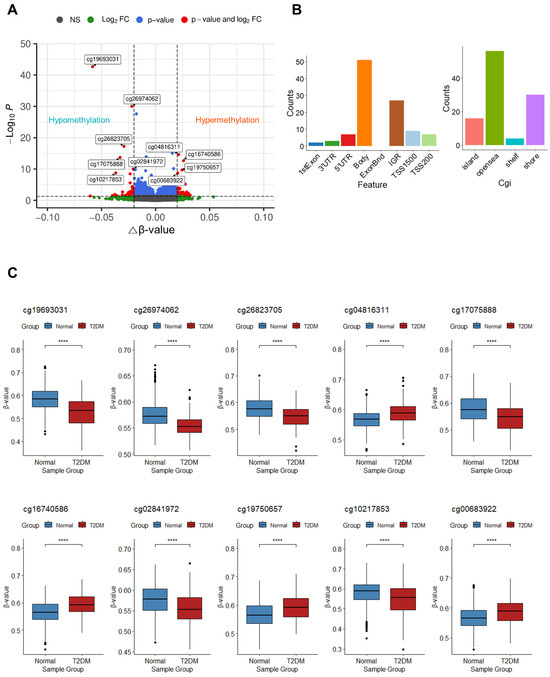 To identify the features of DNA methylation associated with T2DM, we analyzed DMPs between the T2DM and normal groups. A total of 106 DMPs were detected with an adjusted p-value < 0.05 and an absolute change in β-value ≥ 0.02. Among these, 61 DMPs exhibited hypermethylation, whereas 45 DMPs displayed hypomethylation in patients with T2DM (Figure 2A). Within these 106 DMPs, CpG sites were predominantly enriched in the gene body (51 CpGs; 48.11%), followed by the intergenic region (IGR; 27 CpGs; 25.47%), transcription start site 1500 (TSS1500; 9 CpGs; 8.49%), 5′ untranslated region (5′UTR; 7 CpGs; 6.60%), transcription start site 200 (TSS200; 7 CpGs; 6.60%), 3′ untranslated region (3′UTR; 3 CpGs; 2.83%), and the first exon (2 CpGs; 1.89%) (Figure 2B, left panel). The majority of CpG sites were located in open sea regions (56 CpGs; 52.83%), followed by shore (30 CpGs; 28.30%), island (16 CpGs; 15.09%), and shelf (4 CpGs; 3.77%) (Figure 2B, right panel). The 10 top DMPs are documented in Table 2, with the two highest-ranked DMPs (cg19693031 and cg26974062) found within the 3′UTR or body of TXNIP. These two DMPs exhibited significant hypomethylation in patients with T2DM (p < 0.05). Similarly, cg17075888, cg26823705, and cg10217853 within PDK4, NBPF20, and ARRDC4, respectively, showed significant hypomethylation, whereas cg04816311, cg16740586, cg19750657, and cg00683922 located within C7orf50, ABCG1, UFM1, and PFKFB2 displayed significant hypermethylation in patients with T2DM, respectively. Additionally, substantial hypomethylation of one of the 10 top DMPs, cg02841972, which are found in the intergenic region of chromosome 2, was noticed (p < 0.05) (Figure 2C).