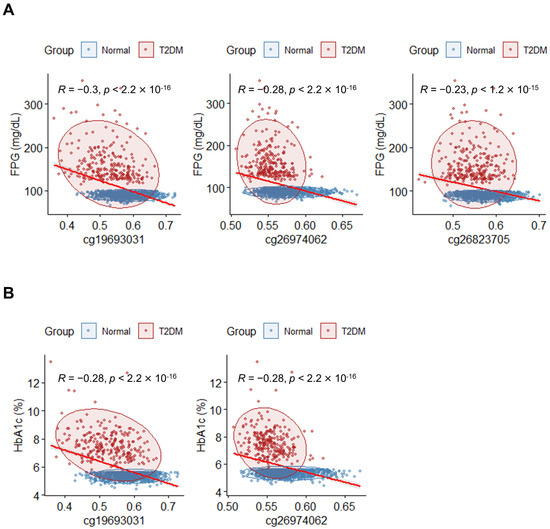 Correlation between methylation levels of DMPs and diabetic markers of the blood. (A) Correlation analysis between FPG and DMPs with p < 0.05; |R| ≥ 0.2 (Spearman correlation). The x-axis indicates β-values for individuals, and the y-axis indicates FPG levels (mg/dL). Individuals in the T2DM and normal groups are indicated by red and blue dots, respectively. The red line represents the regression line. (B) Correlation analysis between HbA1c and DMPs with p < 0.05; |R| ≥ 0.2 (Spearman correlation). The x-axis indicates β-values for individuals, and the y-axis indicates HbA1c (%). Individuals in the T2DM and normal groups are indicated by red and blue dots. The red line represents the regression line.