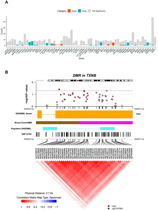 Results of DMR analysis. (A) Bar graph illustrating counts of hypermethylated or hypomethylated DMPs in each DMR. Dark orange, cyan, and light grey sections in the bar graph indicate the count of hypermethylated, hypomethylated, and not significant probes, respectively. (B) Analysis of co-methylation pattern for the DMR surrounding TXNB. The upper panel displays a regional Manhattan plot of the DMR surrounding TXNB. The y-axis represents −log10(p-value) for each CpG probe in the DMR, and the x-axis represents the genomic location of each CpG site. In the middle panel, annotation tracks for gene, broad ChromHMM, regulation, and SNPs are presented. Within the broad ChromHMM track, pink and brown tracks correspond to repressed and heterochromatin/low signal regions, respectively, and, within the regulation ENSEMBL track, sky blue track corresponds to CTCF binding site, as defined in the coMET user guide (https://www.bioconductor.org/packages/devel/bioc/vignettes/coMET/inst/doc/coMET.pdf; accessed on 30 November 2023). In the lower panel, the co-methylation pattern of CpG probes within the DMR is depicted, displaying a heatmap of the Spearman correlation coefficients (R). In this heatmap, red indicates a positive correlation with relatively high R values, whereas blue indicates a negative correlation with relatively low R values.