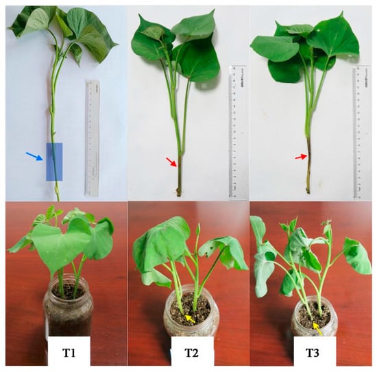 Xushu 48 seedling phenotypes at different stages of the stem rot infection. The red arrow indicates the stem lesion on the sweet potato seedling infected with stem rot. T1, T2, and T3 refer to the seedlings infected with sterile water for 0 days, the seedlings infected with stem rot for 3 days, and the seedlings infected with stem rot for 6 days, respectively. The blue area pointed to by the blue arrow in the picture is the wound area from sand wear. The yellow arrow indicates the location of the inoculated bacterial suspension. The red arrow indicates the epidemic area of stem rot.