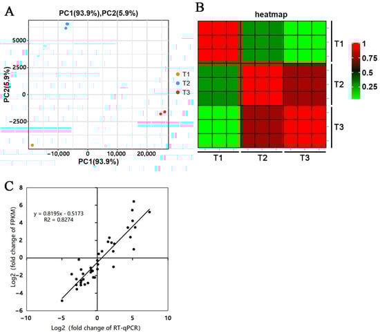 The principal component and heat map analyses of the stem rot pathogen-infected Xushu 48 samples, collected in three stages (T1, T2, and T3), revealed that the T1, T2, and T3 samples were clearly separated, whereas the replicates in each stage were clustered (Figure 2A,B). These results reflected the stability and reliability of the transcriptome data. Thirteen DEGs were selected for the qRT-PCR analysis. The transcriptome data (fold-change in the FPKM values) were closely correlated with the qRT-PCR data for the 13 DEGs (R2 = 0.826). Accordingly, the transcriptome data were accurate and reliable. For each sample, more than 6 GB of sequencing data was generated (>99% clean data). Thus, the amount of sequencing data satisfied the study requirements (Supplementary Table S2).