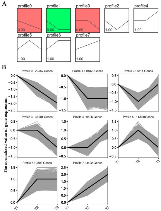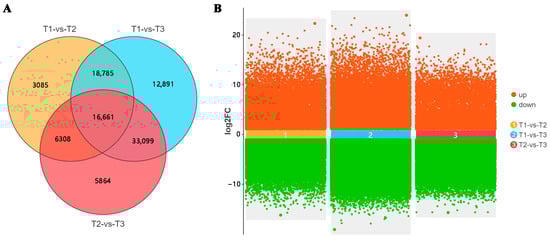 The DEGs in the stem rot pathogen-infected Xushu 48 samples, collected at different stages, were analyzed. A total of 44,839 DEGs were detected between T2 and T1, including 17,351 up-regulated genes and 27,488 down-regulated genes. There were 81,436 DEGs between T3 and T1, including 16,820 up-regulated genes and 64,616 down-regulated genes. There were 61,932 DEGs between T3 and T2, including 11,369 up-regulated genes and 50,563 down-regulated genes (Figure 3).