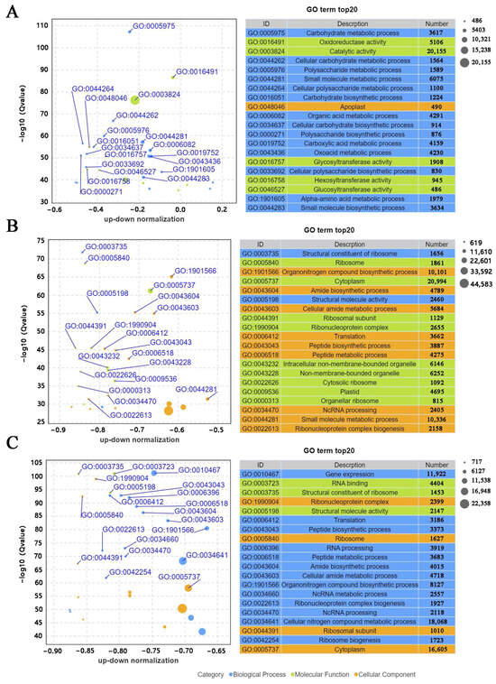 Top 20 significantly enriched GO terms. (A) Top 20 significantly enriched GO terms assigned to the DEGs between T1 and T2. (B) Top 20 significantly enriched GO terms assigned to the DEGs between T1 and T3. (C) Top 20 significantly enriched GO terms assigned to the DEGs between T2 and T3.