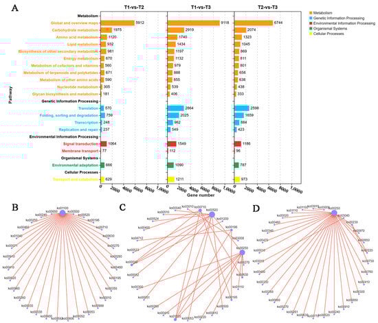 Enriched KEGG pathways among the DEGs in the stem rot pathogen-infected Xushu 48 stem segments at different stages. (A) Quantitative statistics of the DEGs associated with different metabolic pathways. The numbers next to the orange, blue, red, green, and yellow bars represent the number of DEGs associated with metabolism, genetic information processing, environmental information processing, organismal systems, and cellular processes, respectively. Correlations among the metabolic pathways associated with the DEGs between T1 and T2 (B), T1 and T3 (C), and T2 and T3 (D). Each purple dot in (B–D) represents a metabolic pathway, and the lines connecting the two points indicate that there is an upstream and downstream relationship between the two metabolic pathways or that there are common differentially expressed genes.