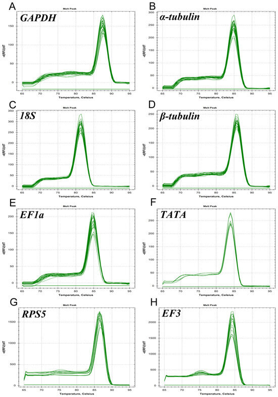 Melting curve analysis of 8 candidate reference genes. Melting curve analysis of (A) GAPDH; (B) α-tubulin; (C) 18S; (D) β-tubulin; (E) EF1a; (F) TATA; (G) RPS5; and (H) EF3.