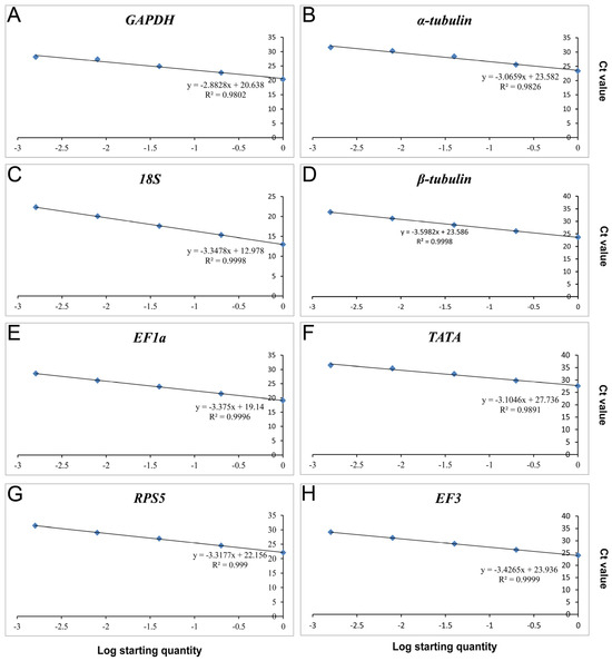 Standard curves of the eight candidate genes. Standard curves of of (A) GAPDH; (B) α-tubulin; (C) 18S; (D) β-tubulin; (E) EF1a; (F) TATA; (G) RPS5; and (H) EF3.