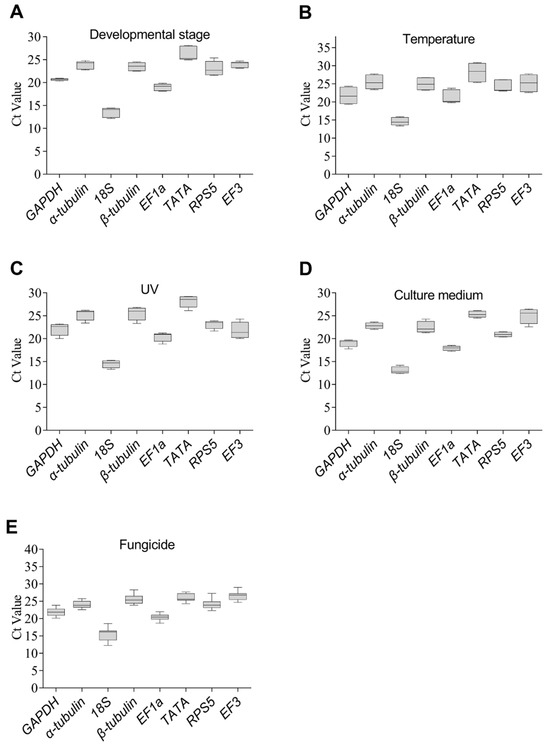 Box and whisker plots of Ct values for eight candidate reference gene across five experimental conditions. (A) different developmental stages, (B) different temperatures, (C) different times treated by UV, (D) different culture media, and (E) different fungicides. All the independent experiments were repeated three times. Boxes represent lower and upper quartiles of cycle thresholds range with medians indicated, and whisker caps represent maximum and minimum values. About 75 ng of cDNA was added for each experiment.