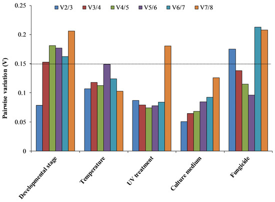 Optimal reference gene numbers for effective normalization. Pairwise variation (V) in the candidate reference genes calculated via geNorm based on different comparisons: developmental stage, temperature, UV, culture medium, and fungicide.