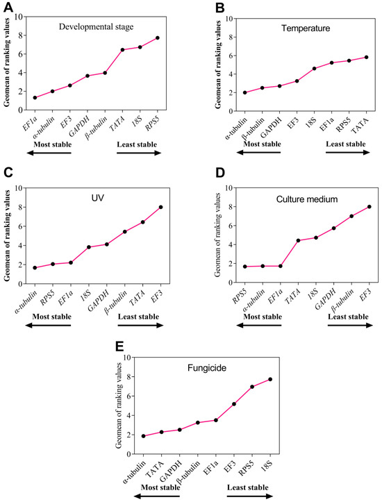 NormFinder. NormFinder analysis identified the most stable reference gene for each condition: EF1a for fungal development stage, α-tubulin for temperature and culture medium, RPS5 for UV treatments, and GAPDH for fungicide comparisons.