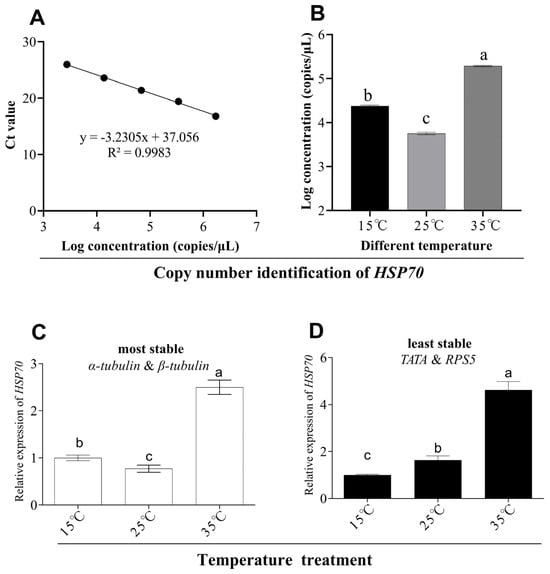 In order to determine the copy number of HSP70 under different temperature treatments, a standard curve of the HSP70 gene was made (Figure 7A) and the copy number of HSP70 under different temperature treatments was determined from the standard curve. Based on the results, we learnt that HSP70 has a higher copy number at both low and high temperatures as compared to that under 25 °C conditions (Figure 7B). Similarly, when we calculated the relative expression of HSP70 using the most stable reference gene, this was consistent with the above results (Figure 7C). However, when the least stable reference gene was utilized, inconsistent results were obtained (Figure 7D).