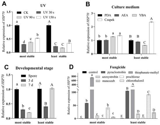 The relative expression of HSP70 in different treatments. The relative expression of HSP70 under UV treatment times (A) was normalized to that of the most stable (α-tubulin and RPS5) and least stable (TATA and EF3) reference genes. CK means that the UV treatment time was 0. The relative expression of HSP70 for culture media (B) was normalized to that of the best genes (RPS5 and α-tubulin) and worst genes (β-tubulin and EF3), respectively. The relative expression of HSP70 in developmental stages (C) was normalized to that of the best genes (EF1a and α-tubulin) and worst genes (18S and RPS5), respectively. The relative expression of HSP70 treated using different fungicides (D) was normalized to that of the best genes (α-tubulin, TATA and GAPDH) and worst genes (EF3, RPS5, and 18S). Control means that fungi were cultured without fungicides. The values are means ± standard error. Significant differences normalized to the most stable are indicated by different lowercase letters (p < 0.05). Significant differences normalized to the least stable are indicated by different uppercase letters (p < 0.05).