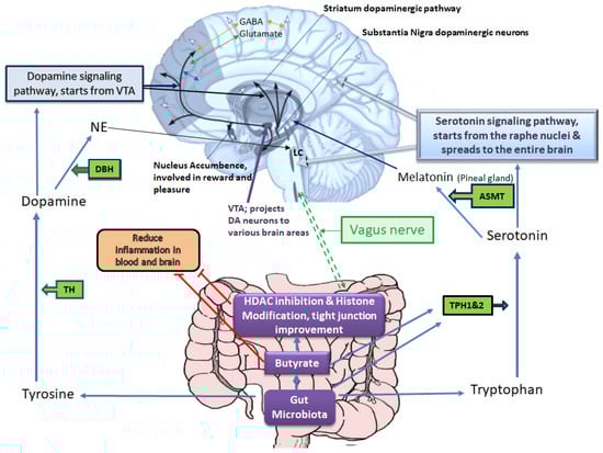 Among environmental factors, the gut microbiota composition is a key player in serotonin and dopamine production, which may play significant roles in delaying or accelerating depression by regulation of tryptophan availability and, subsequently, serotonin synthesis in the gut and brain cells [,]. The gut microbiome–derived metabolites such as butyrate are capable of enhancing the expression and Tph1 activity [,,]. The production of serotonin in the gut, in turn, can influence brain functions via stimulation of the vagus nerve [], while blood serotonin level affects the blood-brain-barrier (BBB) permeability as well []. Moreover, butyrate and epigenetic drugs with similar effects (e.g., sodium valproate) can promote the production of dopamine, noradrenaline, and other related neurotransmitters via enhancing the transcription of the tyrosine hydroxylase (TH) gene [,].