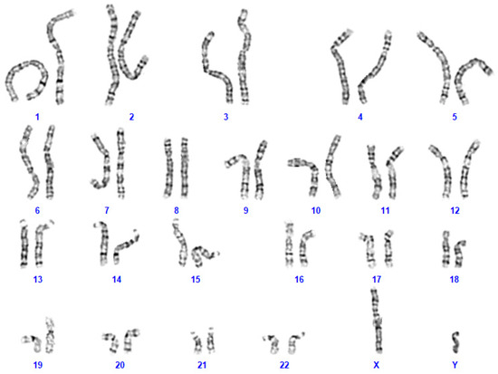 Upon genetic counselling of the parents, genetic analyses were initiated at the age of 2 years. Karyotyping by GTG banding identified an interstitial chromosomal 2p11.2 heterozygous microdeletion (Figure 2). Karyotyping by GTG banding of the parents did not reveal any chromosomal abnormalities. A detailed FISH analysis of parental chromosomes 2 did not identify any chromosomal abnormalities neither. Taken together, these chromosomal analyses indicated that the heterozygous microdeletion had appeared de novo in the patient. Angelman Syndrome was excluded by detailed analysis of the patient’s chromosomal region 15q11.