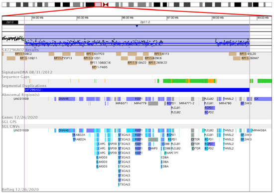 Array CGH analysis showing the heterozygous interstitial microdeletion arr[hg18] 2p11.2(83,836,581_88,835,028)x1 in detail. The 2p11.2 chromosomal region (top row, red box) is enlarged to show in detail (from top to down): probe array signals (black dots) with heterozygously deleted region (shaded in blue); sequence gaps (green, orange); deleted genes and loci (gray, blue, light blue). This image has been extracted from www.genoglyphix.com (PerkinEmer).