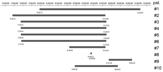 Of note, only in patients 1 and 9 is the malformation of vessels reported [3,7]. The microdeletion in these two patients spans further from the centromere compared to the other deletions listed in Figure 4. This could suggest that deletions between 88′835,025 and 91,304,813 have an impact on the formation of vessels. A literature review of the affected genes could help to support this statement.