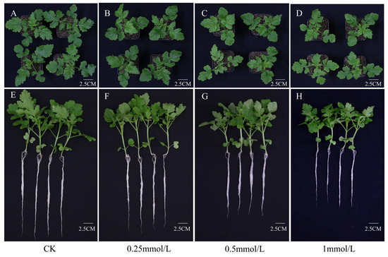 Seedlings performance of S. alba treated with different concentrations of CdCl2 solutions. (A–D): the performance of shoots of S. alba plants treated with 0 mmol/L (CK), 0.25 mmol/L, 0.5 mmol/L, and 1 mmol/L CdCl2 solutions for 3 days. (E–H): the performance of young seedlings treated with 0 mmol/L (CK), 0.25 mmol/L, 0.5 mmol/L, and 1 mmol/L CdCl2 solutions for 3 days.