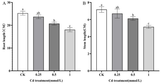 The changes in root and stem length of S. alba after treatment with different concentrations of CdCl2. (A): root length. (B): stem length. Different letters represent the significantly different groups, and significance was determined by multiple comparisons using Fisher’s least significant difference (LSD) method (p < 0.05). The error bar in chart indicates standard deviation (SD), and three replicates (n = 3) per sample are used to calculate the value of mean ± SD.