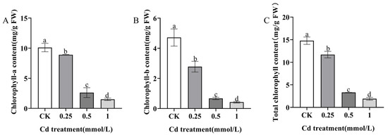 Chlorophyll content changes in S. alba seedlings under different concentrations of Cd treatment. (A): chlorophyll-a content. (B): chlorophyll-b content. (C): total chlorophyll content. Different letters represent significantly different groups determined by the LSD method (p < 0.05). The error bar in the chart indicates the standard deviation (SD), and three replicates (n = 3) per sample were used to calculate the mean ± SD.