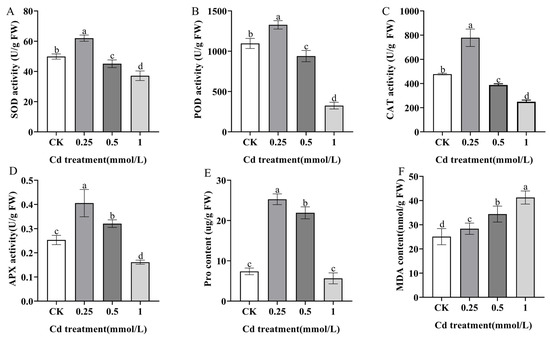 Physiological indicators change in S. alba seedlings under different concentrations of Cd treatment. (A): SOD activity. (B): POD activity. (C): CAT activity. (D): APX activity. (E): Pro content. (F): MDA content. Different letters represent significantly different groups determined via the LSD method (p < 0.05). The error bar in the chart indicates the standard deviation (SD), and three replicates (n = 3) per sample were used to calculate the mean ± SD.