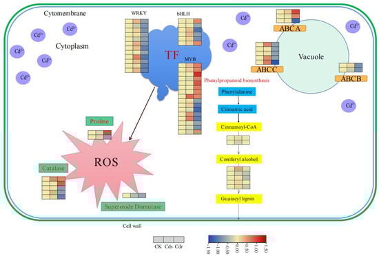 Cd primarily exists as Cd2+ ions in the soil, which can be easily absorbed by plant roots, especially in regions with root hairs. These ions accumulate in various organs of the plant due to their biological mobility [51]. Cd2+ is transported to the xylem through both apoplastic and symplastic pathways in the root epidermis and root cortex. Once Cd2+ enters the xylem, it is efficiently transported to the stems and leaves [52]. Many transport factors or genes involved in synthesis of the cell wall and lignin play an important role in the process of Cd2+ transport, absorption, and accumulation. ABC transporters are a class of transmembrane transporters that play a crucial role in various plant processes, including hormone transport, lipid metabolism, detoxification of toxins, and stress resistance. In A. thaliana, AtABCG36 expels intracellular Cd to the outside of the cell, reducing the harm caused by Cd toxicity [53]. AtABCB25, located on the mitochondrial membrane, enhances the tolerance of Arabidopsis plants to Cd when overexpressed [54]. AtABCC1, AtABCC2, and AtABCC3 transport Cd from the cytoplasm into vacuoles, thus minimizing the damage caused by Cd toxicity to plants [55]. In this study, we identified a total of 10 DEGs belonging to the ABC transporter family in the roots. Among them, three DEGs belonged to the ABCA transporter family, one DEG belonged to the ABCB transporter family, and five DEGs belonged to the ABCC transporter family (Figure 9, Table S5). Most of these genes were down-regulated, with only two up-regulated DEGs. This down-regulation may be attributed to the evident toxic effects of Cd on S. alba. In the phenylpropanoid biosynthesis pathway, two DEGs, Sal02g36790L and Sal06g23960L, were identified to be involved in the biosynthesis of cinnamoyl-CoA, which is responsible for secondary wall formation in plants [56]. Additionally, five DEGs (one up-regulated and four down-regulated) were found to be associated with the biosynthesis of coniferyl alcohol, which is an important component of lignin that participates in the formation of the cell wall [57].