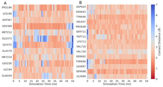 Heatmaps were generated by using the distance matrix derived from spatial measurements obtained during MD trajectory analysis in order to visualize close contacts between residues in RPA2 and MLH1 and the designed ligand. The residues chosen to be displayed on the heatmap are those involved in interactions during the entire 50 ns simulation, identified by an average minimum distance to any ligand atom less than 3.5 Å. The principal interacting elements of the protein are depicted throughout the entire simulation, where blue and red hues indicate more or fewer close contacts (Figure 1).