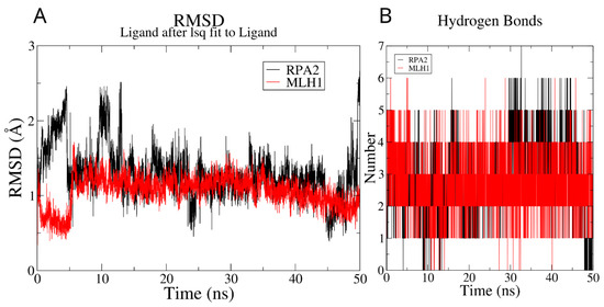 The RMSD analysis of the 50 ns MD simulation revealed that, around 6 ns into the simulation, the newly designed ligand consistently converged to stable conformations. This convergence signifies the establishment of stable molecular arrangements, demonstrating the overall stability of the ligands throughout the simulation (Figure 2A). The radius of gyration for the ligand molecule in two distinct complex formations, as illustrated in Figure S3, demonstrates a similar convergence pattern derived from RMSD analysis. The fluctuation in the number of hydrogen bonds formed during the simulations is illustrated in Figure 2B, revealing a range from 2 to 6 for MLH1 and 1 to 5 for RPA2. Throughout the majority of timepoints, MLH1 consistently maintained at least three hydrogen bond interactions, whereas RPA2 sustained two hydrogen bonds. This dynamic observation underscores the varying hydrogen bond profiles between the ligand and the two proteins, with MLH1 generally exhibiting a higher number of hydrogen bonds compared to RPA2 during the simulation course.
