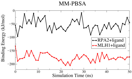 An MD simulation system containing the RPA2 and MLH1 target proteins in complex with the newly designed ligand was set up; several simulations of both the perturbed (protein–ligand) and unperturbed (protein without ligand bound to it) system were performed in order to assess the consistency of the simulation results [43].