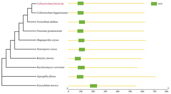 MoHox1 (M. oryzae) was named with the rice blast fungus M. oryzae HOX1 gene MGG 04853 (the gene sequence of M. oryzae 70-15), and the HTF2 sequence (named CfHTF2) was searched for in the C. fructicola genome. To further analyze the kinship of CfHTF2 between different species, the selected HTF2 protein sequences of Magnaporthe oryzae (GenBank: XP_003712331.1), Verticillium dahliae (GenBank: KAF3347114.1), Fusarium graminearum (GenBank: XP 011328782.1), Exserohilum turcica (GenBank: XP008029609.1), Aspergillus flavus (GenBank: AFLA 069100), Neurospora crassa (GenBank: XP_961320.1), Botrytis cinerea (GenBank: EMR85177), Colletotrichum higginsianum (GenBank: XP_018160237.1) and Saccharomyces cerevisiae (GenBank: AJV10273) were selected to construct phylogenetic trees and conserved domain models (Figure 1). The HTF2 proteins of C. fructicola and C. higginsianum were clustered in a single clade, with the closest affinity and 99% similarity, and the two species were also the closest relatives, indicating that the results of the phylogenetic tree construction were reliable. Domain analysis of each species revealed that HTF2 contained a HOX domain near the 5’ end, and the closer the evolutionary tree was to each other, the closer the location of the domain was (Figure 1).