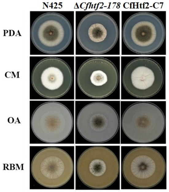 To analyze the function of CfHTF2 in regulating vegetative growth processes, wild-type N425, ΔCfhtf2-178 and CfHtf2-C7 were inoculated into PDA, CM, OA or RBM media and cultured for 5 days in a light incubator at 26 °C for 12 h/12 h. Compared with wild-type N425 and CfHtf2-C7, ΔCfhtf2-178 significantly decreased the colony growth diameter on different media, and ΔCfhtf2-178 became denser in terms of colony morphology (Figure 3). There was no significant difference in colony morphology or colony diameter between the wild-type and CfHtf2-C7 plants (Figure 3). These findings indicate that the loss of CfHTF2 slows the vegetative growth of C. fructicola and that CfHTF2 is involved in the regulation of C. fructicola hyphal growth.